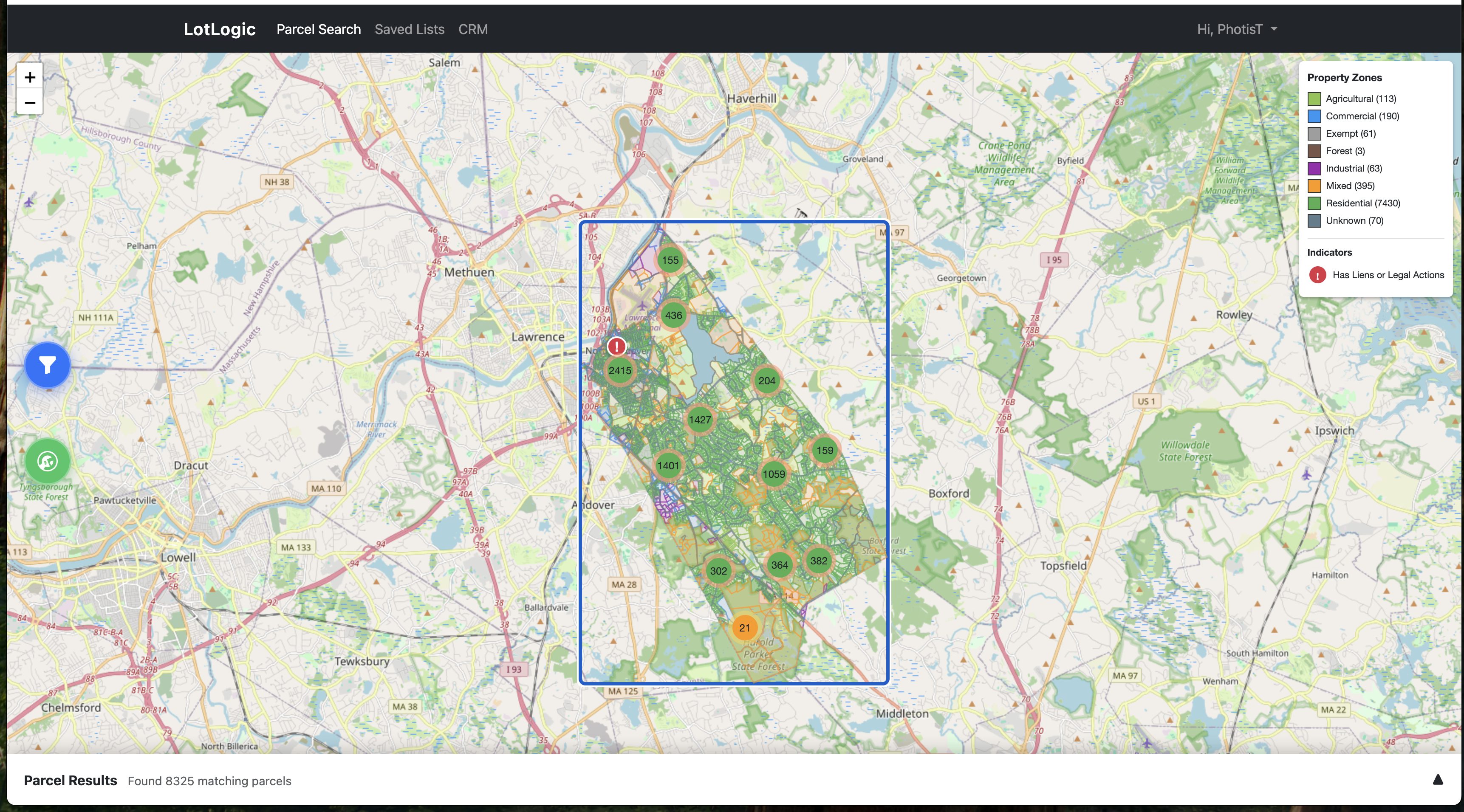 Filter parcels by ownership type, years owned, zoning, and other investment signals.